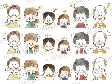 三世代家族のひらめきや困惑や涙の表情セット-水彩
