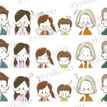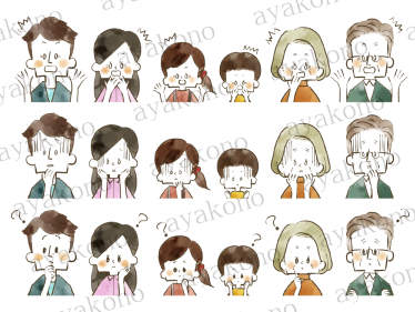 三世代家族の驚きやショックや疑問の表情セット-水彩