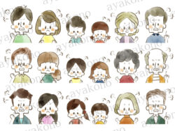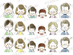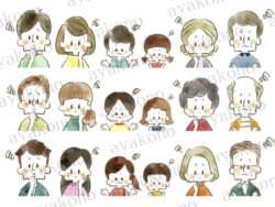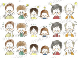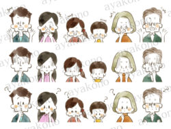 水彩 三世代家族のひらめきや困惑や涙の表情セット-水彩