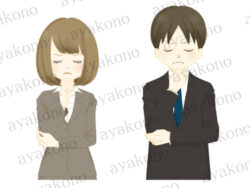 主線あり 目を閉じて考えるスーツ姿の男女